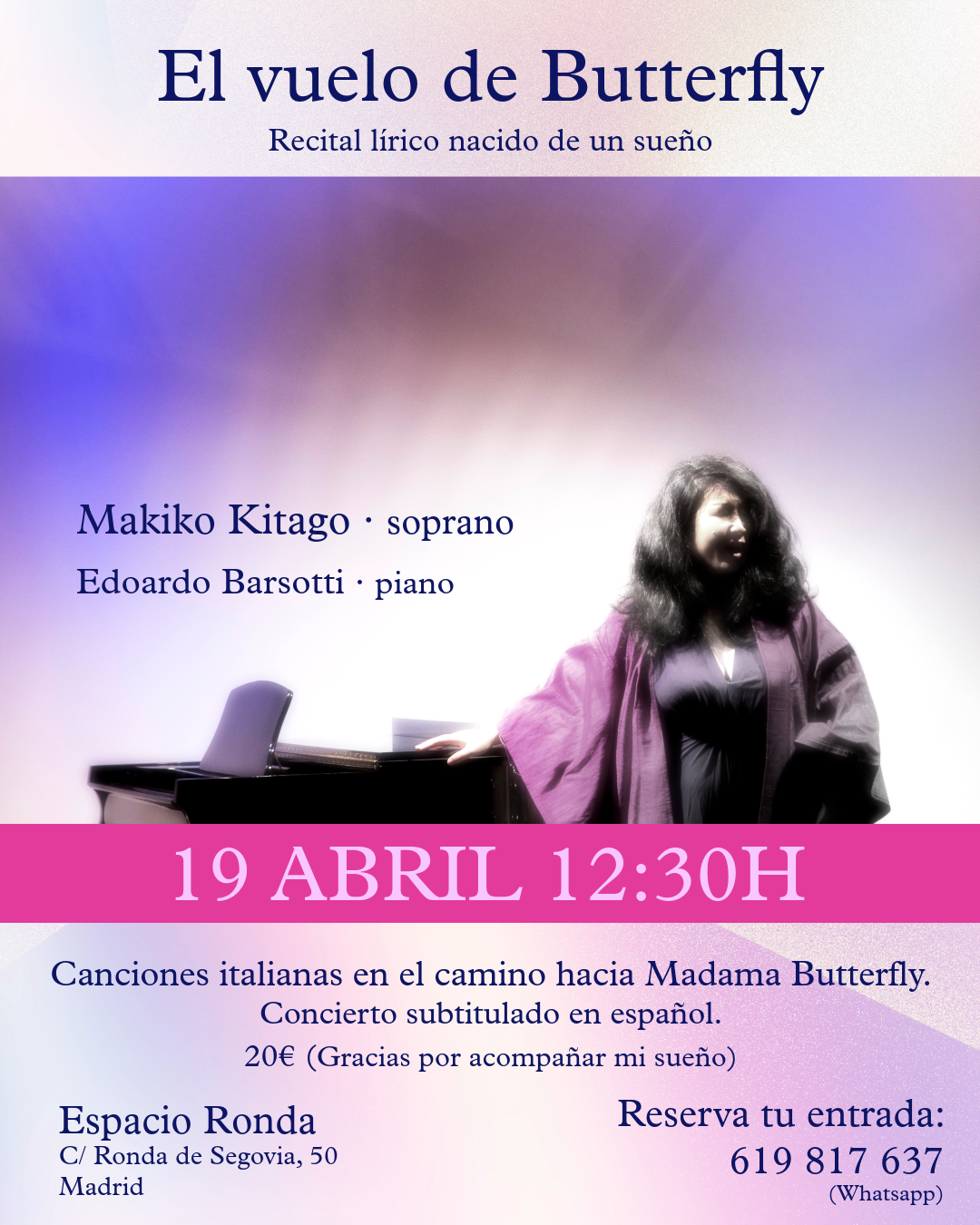 Junto al pianista Edoardo Barsotti, interpretaré un programa de canciones italianas que forman parte de este camino hacia Madama Butterfly. Cada pieza es un paso más en ese vuelo renovado.